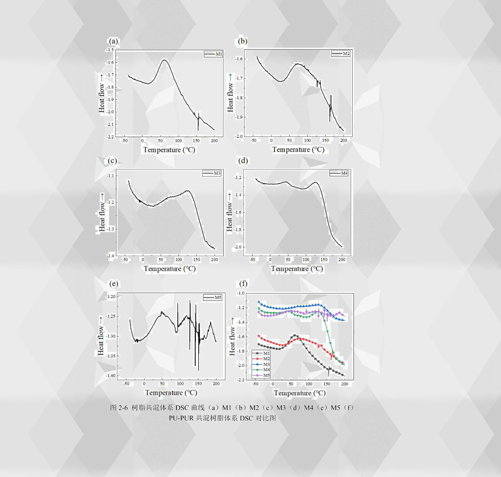 從PU-PUR共混樹脂的DSC曲線對其固化行為進(jìn)行分析。從M1樹脂的DSC曲線2-6(a)上看到,曲線在35.41-86.16℃之間出現(xiàn)了一個明顯的放熱峰,這就是M1樹脂的固化反應(yīng)峰,其峰值為59 .66℃。從M2樹脂的DSC曲線2 - 6(b)上看到,曲線在45.16-120.16℃之間出現(xiàn)了一個明顯的放熱峰,這就是M2樹脂的固化反應(yīng)峰,其峰值為73.66℃。從M3樹脂的DSC曲線2-6(c)上看到,曲線在94.58-138.25℃出現(xiàn)了一個明顯的放熱峰,這就是M3樹脂的固化放熱峰,其峰值為125.08℃。從M4樹脂的DSC曲線2-6(d)上看到,曲線在98.58-140.83℃出現(xiàn)了一個明顯的放熱峰,這就是M4樹脂的固化放熱峰,其峰值為126.16℃。從M5樹脂的DSC曲線2-6(e)上看到,曲線出現(xiàn)了兩個較大的放熱峰,其中第二個較大的放熱峰位于96.50-138.08℃之間,其峰值為116.75℃。通過不同共混樹脂的DSC曲線對比2-6(f)可以看出,聚脲的加入使得共混樹脂放熱峰朝著較高溫度移動,而通過M3、M4樹脂的曲線可以看出,當(dāng)聚脲含量占到共混樹脂的50%以上時,共混樹脂的固化峰值變化不大。從共混樹脂的DSC曲線和樹脂流變測試結(jié)果分析得出,樹脂DSC曲線的峰值和樹脂流變粘度-溫度曲線轉(zhuǎn)變點的結(jié)果大致符合,因此表2-3能夠作為樹脂共混體系的最佳固化溫度和時間使用。
