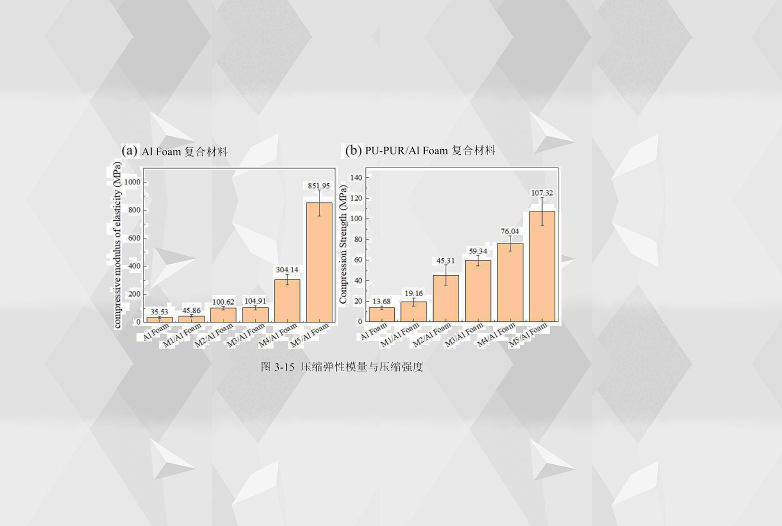 壓縮強度表示材料抵抗壓縮載荷而不失效的能力,從圖3-15(b)中看到,PU-PUR/Al Foam復合材料的壓縮強度都隨著聚脲含量的增大而提高。Al Foam的壓縮強度為13.68MPa,M1/Al Foam的壓縮強度為19.16 MPa,Al Foam增加了40.05%M2/Al Foam的壓縮強度為45.31MPa,M1/Al Foam增加了136.48%M3/Al Foam的壓縮強度為59.34MPa,M2/Al Foam增加了30.96%M4/Al Foam的壓縮強度為76.01MPa,M3/Al Foam增加了28.14%M5/Al Foam的壓縮強度最高,為107.32MPa,M4/Al Foam增加了41.13%
