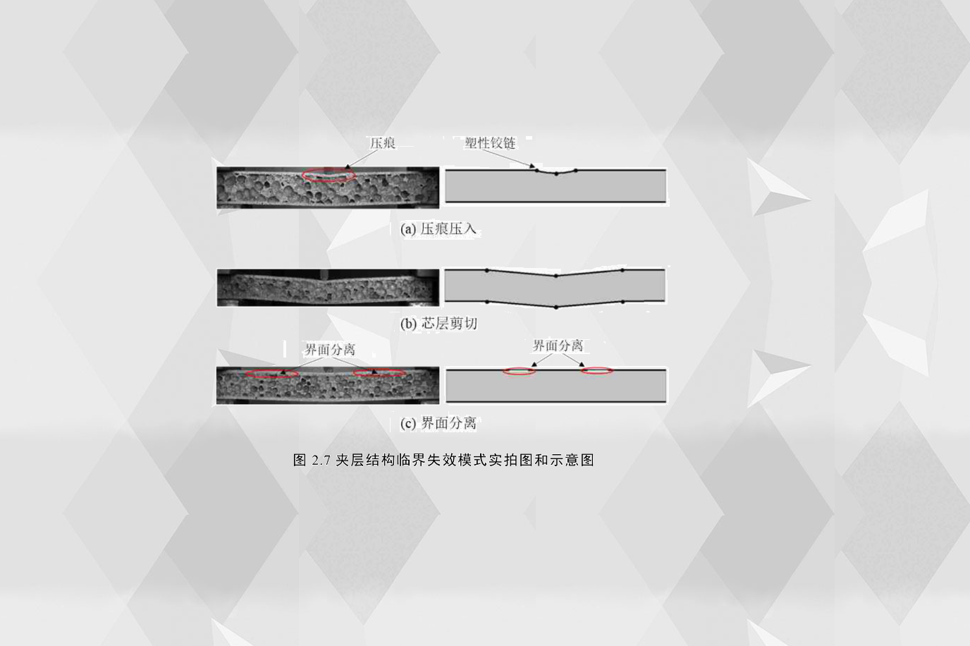 通過實(shí)驗(yàn)觀察分析得出,泡沫夾層結(jié)構(gòu)在彎曲工況下三種主要的臨界失效模式為壓痕壓入、芯層剪切和界面分離,如圖2.7所示。臨界失效模式壓痕壓入(IN)的主要特征是壓頭正下方部分夾層結(jié)構(gòu)的上面板有鉸鏈并且附近的芯層有明顯的局部壓痕;通過圖2.7(a)可以觀測到,壓頭附近的上面板有三個(gè)鉸鏈,而在此時(shí)刻下面板的位移很小,基本可以忽略其位移量。如圖2.7(b)所示,臨界失效模式芯層剪切(CS) 的主要特征是上下面板位置平行,并且上下面板各有三個(gè)鉸鏈,鉸鏈的位置一個(gè)位于壓頭正下方,兩外兩個(gè)分別位于兩支撐端附近,該失效模式與Ashby等人在參考文獻(xiàn)中提到的ModeB類似。最后一種臨界失效模式為界面分離(DB),夾層結(jié)構(gòu)膠粘劑的完整性確保了載荷在夾層結(jié)構(gòu)各組成部分之間穩(wěn)定傳遞;根據(jù)剪切力互等定理,在臨界失效模式發(fā)生之前,泡沫芯層受到的剪切應(yīng)力等于膠粘劑的剪切應(yīng)力,但在僅涉及由剪切應(yīng)力引起的臨界失效模式的情況下,如果夾層結(jié)構(gòu)受到的最大剪切應(yīng)力超過膠粘劑所能承受的剪切強(qiáng)度,但小于芯層所能承受的剪切強(qiáng)度,則可能會(huì)發(fā)生界面分離(DB)。
