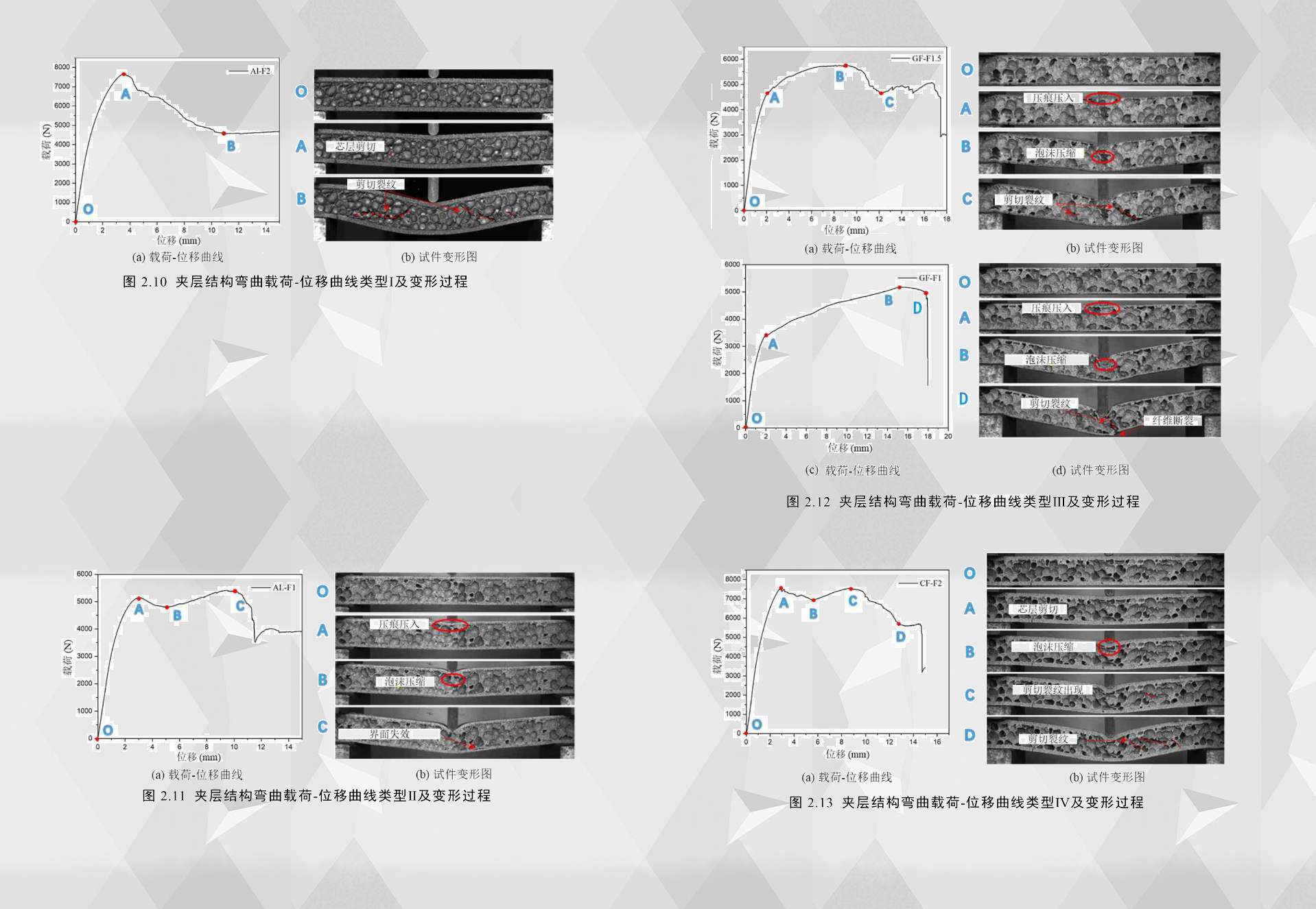 為了研究臨界失效模式對(duì)后繼載荷-位移曲線和后屈曲變形的影響,圖2.10-2.13展示了泡沫鋁夾層結(jié)構(gòu)三點(diǎn)彎曲的幾種典型荷載-位移曲線及其變形時(shí)刻圖,本章中的曲線與以往的相關(guān)研究有一定的差異,這些載荷-位移曲線沒有明顯的面板拉伸以及在初始失效模式之后的后續(xù)硬化行為,這是由于在實(shí)驗(yàn)過程中夾層結(jié)構(gòu)試件與試驗(yàn)夾具的夾持端之間存在相對(duì)滑動(dòng)。根據(jù)夾層結(jié)構(gòu)的臨界失效模式和載荷-位移曲線分析可知,具有相同面板材料但不同臨界失效模式夾層結(jié)構(gòu)的荷載-位移曲線差異很大,并且具有相同臨界失效模式但面板材料不同的夾層結(jié)構(gòu)之間荷載-位移曲線也有一定差異,因此根據(jù)面板材料和曲線形狀不同可以將泡沫鋁夾層結(jié)構(gòu)準(zhǔn)靜態(tài)彎曲試驗(yàn)的載荷-位移曲線分為四類,分別為類型I、Ⅱ、Ⅲ和IV,載荷-位移曲線類型I和Ⅱ?yàn)殇X合金夾層結(jié)構(gòu)所特有,類型Ⅲ和IV 為纖維增強(qiáng)夾層結(jié)構(gòu)所特有,各曲線類型的特點(diǎn)及臨界失效模式分析如下: