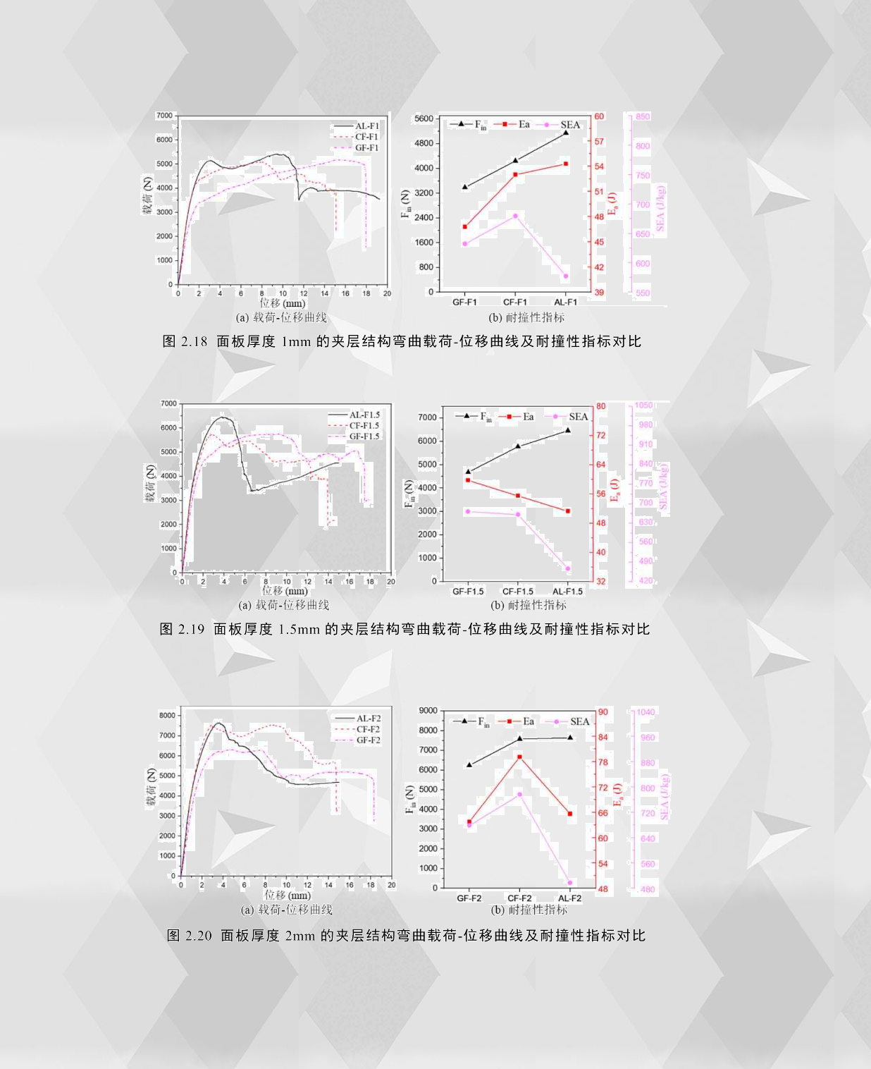 2.4.1面板對結構耐撞性能影響——F為了研究面板材料在彎曲工況下對夾層結構力學性能的影響,比較了同一厚度下不同面板材料的夾層結構的載荷-位移曲線,如圖2.18(a)所示,結合壓潰失效過程分析,對面板為1mm的試件而言,試件GF-F1、CF-F1和AL-F1的臨界失效模式均為壓痕壓入(IN),但纖維增強夾層結構與鋁合金夾層結構不同的是,由于纖維復合材料不像鋁合金那樣有明顯的塑性變形,試件達到臨界失效時,前者的面板發生了彈性變形,后者發生塑性變形,前者載荷達到臨界載荷時會繼續增大,只是增加幅度有所減小,而后者載荷會減小。試件GF-F1在斷裂之前,未出現明顯的芯層剪切裂紋且未出現載荷下降;CF-F1后屈曲過程出現芯層剪切裂紋(彎曲位移約8mm處),而AL-F1后屈曲過程中出現界面失效和剪切裂紋(彎曲位移約10mm處),從載荷-位移曲線中可以看出在這兩處失效時,后者的載荷下降速度更快。